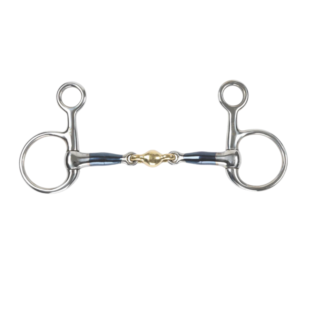 The hanging cheek bit exerts a little poll pressure to encourage flexion. The brass alloy double joint distributes pressure over both the tongue and bars of the mouth to encourage mouthing and contact. Mouthpiece thickness: 13mm. Cheek height: 110mm. Blue sweet iron mouthpieces oxidise easily to create warmth with a sweet taste which helps with bit acceptance and encourages salivation. Please note the blue colour will fade with use. Stainless steel is used for the cheeks due to it being durable, easy to clean and resistance to rust.