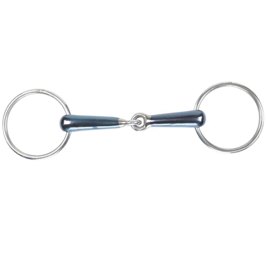 This loose ring bit can discourage fixing as it has much more movement in the horse?s mouth. The hollow mouth is significantly lighter than those with a solid mouthpiece. Mouthpiece thickness: 18mm. Cheek height: 50mm (4.5", 5"), 65mm (5.5", 6"). Blue sweet iron mouthpieces oxidise easily to create warmth with a sweet taste which helps with bit acceptance and encourages salivation. Please note the blue colour will fade with use. Stainless steel is used for the cheeks due to it being durable, easy to clean and resistance to rust.