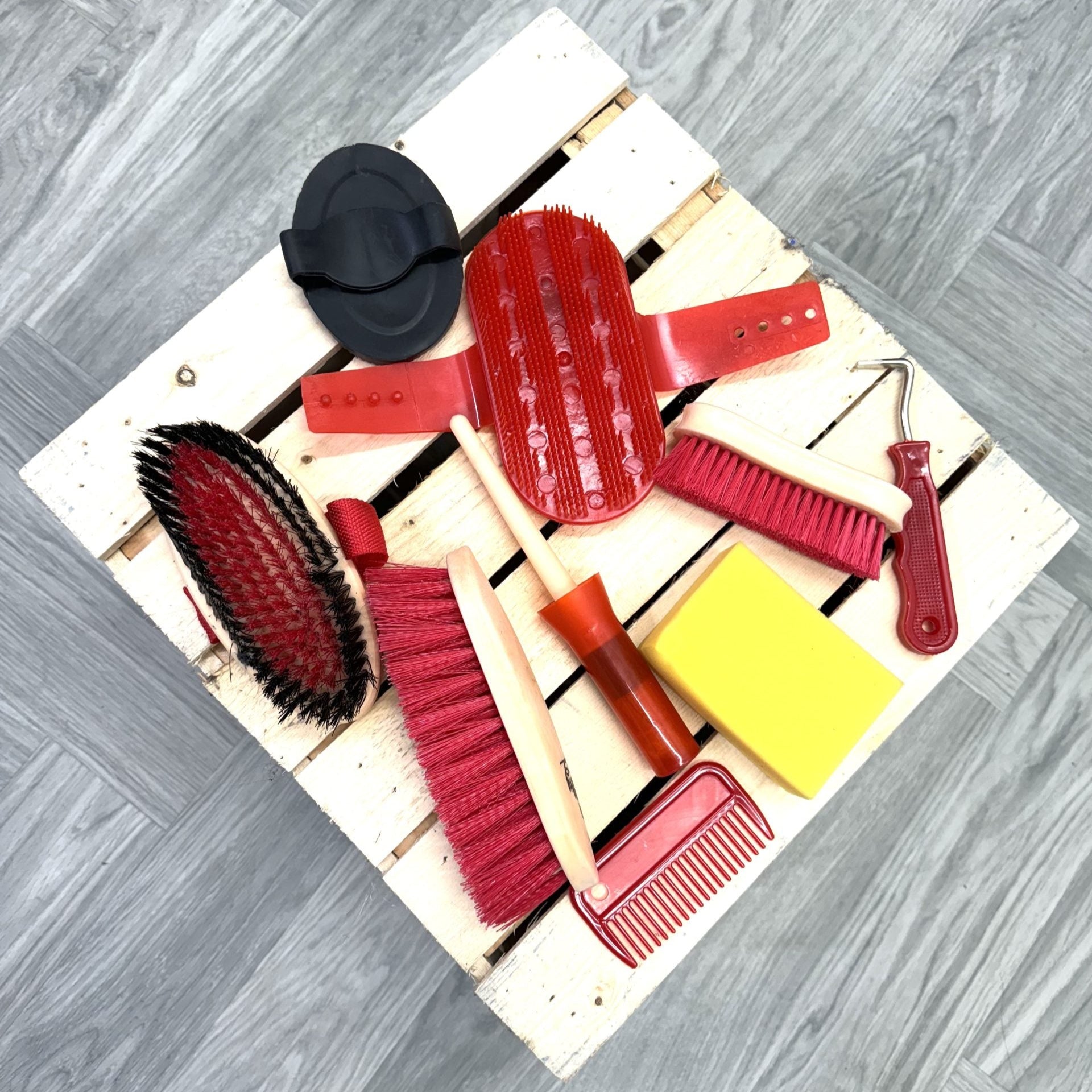 Content : medium dandy, small body, large plastic curry, small rubber curry, mane comb, metal hoof pick, small sponge, hoof or face brush and hoof oil brush with cap in an easy close plastic carry bag.