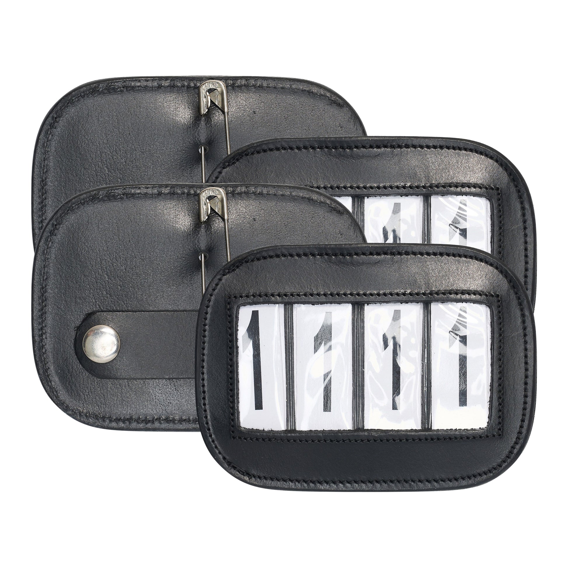 The square leather competition number set features a classic design accommodating three digits. Equipped with safety pin and snap button fastenings, it ensures secure attachment and effortless handling.