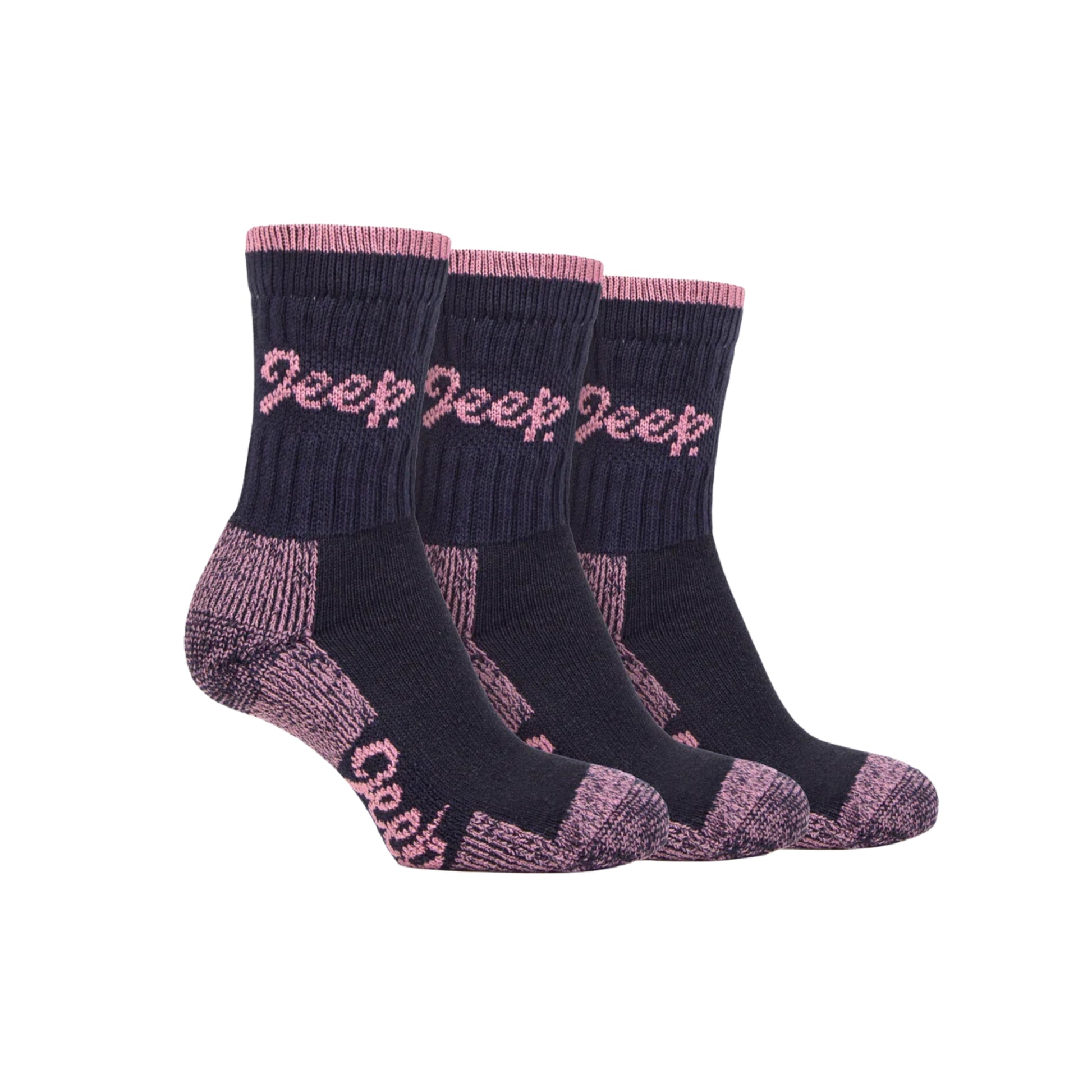 These women's Jeep Luxury Terrain Boot Socks deliver premium comfort for serious outdoor pursuits. Crafted from a cotton-rich heavyweight yarn with substantial texture, the trio pack provides reliable footwear for hiking, walking, and challenging terrain exploration. Half-cushioned terry loop pile in the foot zone enhances insulation and thermal retention, whilst the cotton-rich padding actively wicks moisture to maintain dry skin. Strategic cushioning shields heels, toes, and soles from impact stress during extended activity. The crew-length silhouette pairs seamlessly with ankle boots, featuring wide ribbed legs that ensure a secure fit without constriction. Sports stripe detail cuffs and an embroidered Jeep script logo complete the design, combining functional breathability with distinctive styling for the discerning outdoor enthusiast.