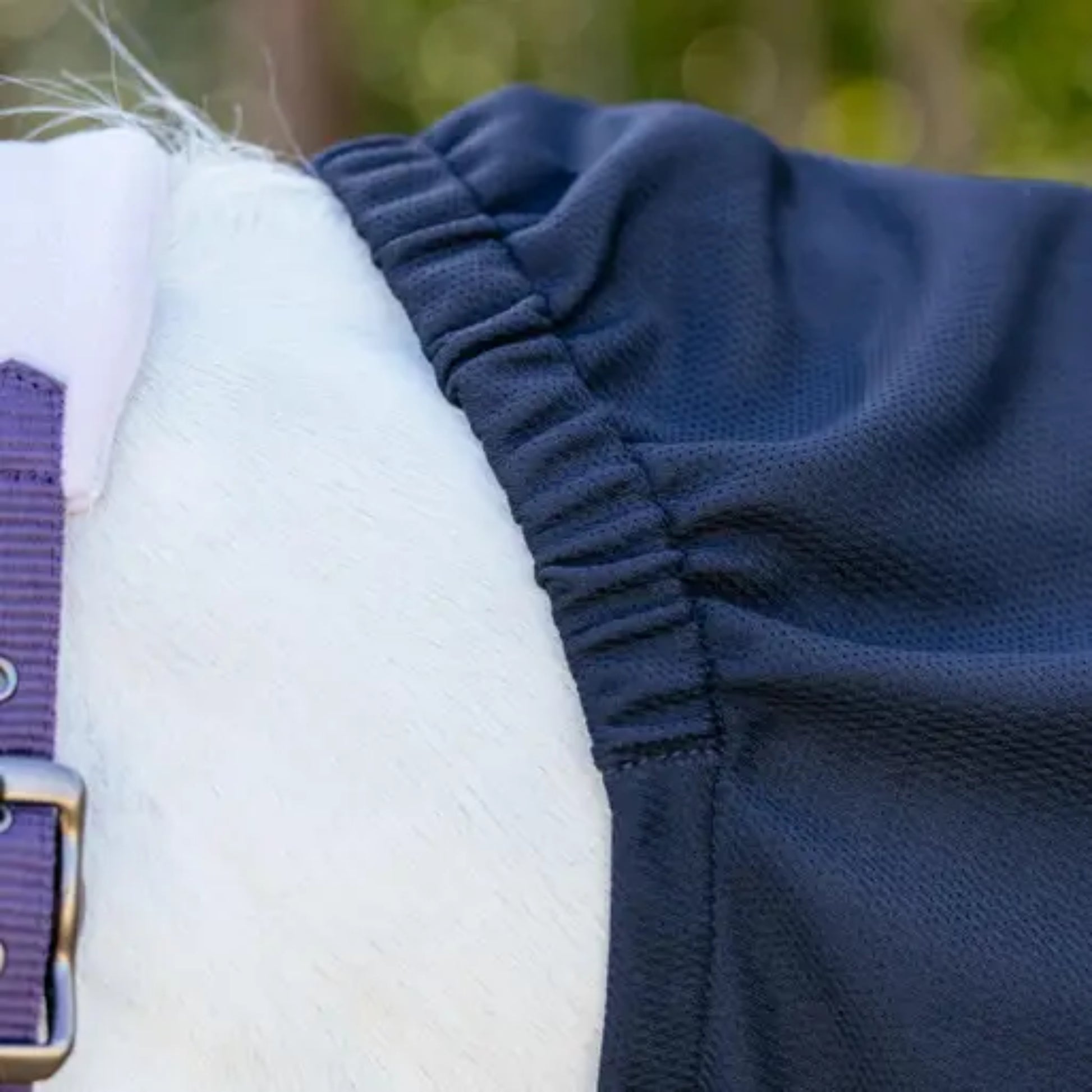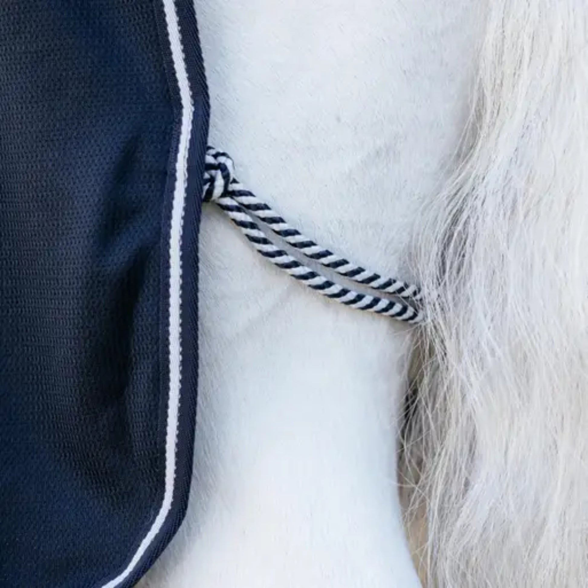 This lightweight, moisture-wicking rug is ideal for drying your horse after a bath. Featuring a bonded microfiber polyester inner layer for rapid drying and a mesh outer layer that enhances evaporation while repelling shavings and dirt, it maximizes drying efficiency. The built-in neck with an elasticated poll ensures a secure fit, effectively drying the mane. It fastens securely with a T-bar front closure and adjustable surcingle, accented by a two-tone fillet string with silicone-dipped ends. Comes with a mesh drawstring bag for easy storage and convenient transport.