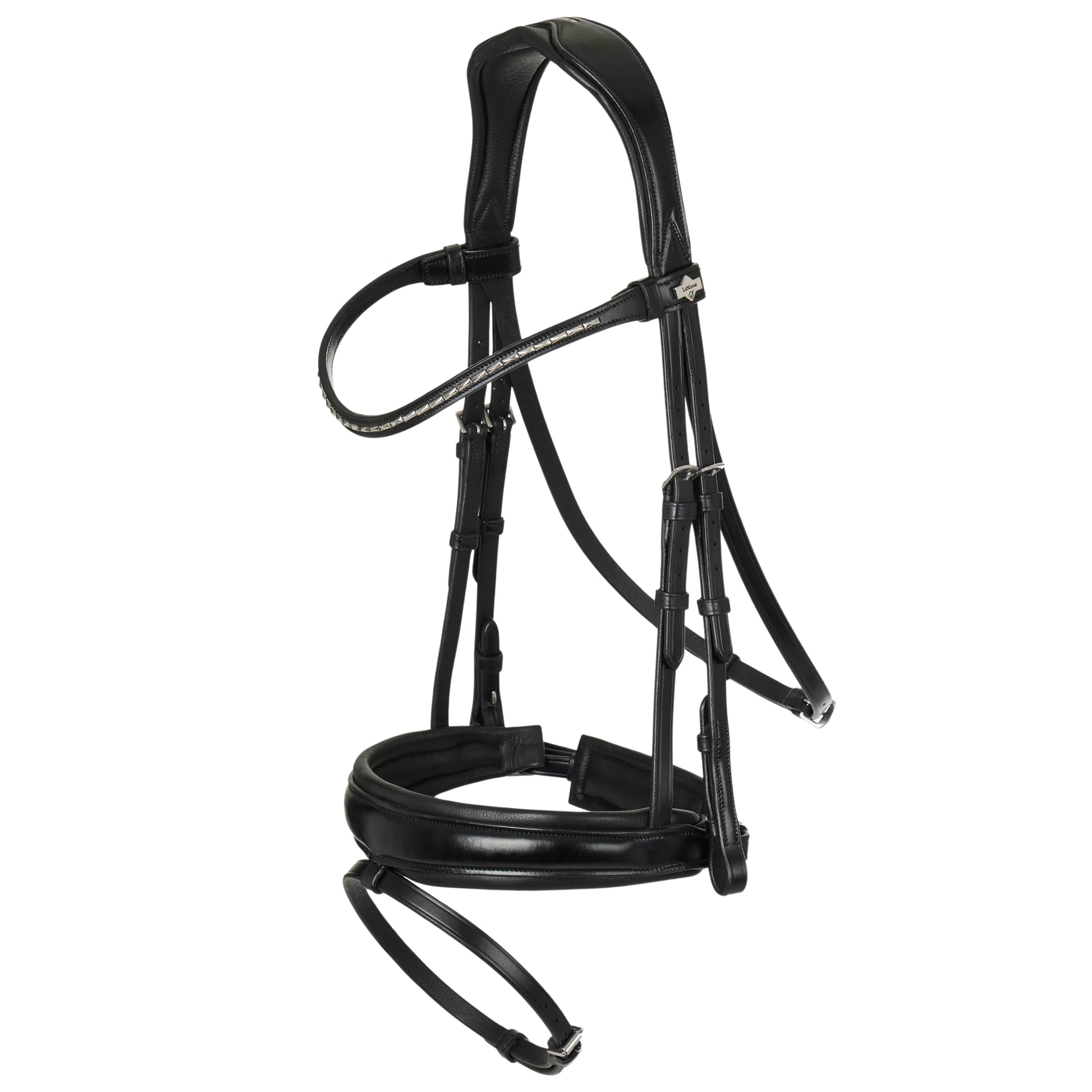 The LeMieux Kudos Classic Dressage Bridle blends timeless design with modern refinement, ideal for competition. It features an anatomically shaped, detachable clincher browband paired with a striking padded crank noseband. The crank pad offers superior cushioning for enhanced comfort, complemented by roller buckles on the crank strap and flash. A discreet throat lash fastens under the jaw, creating a sleek profile. Crafted from supple European leather, the bridle includes an anatomically contoured headpiece with soft padding around the ears and poll to evenly distribute pressure. Available in black or brown with silver fittings, it complements the matching brown Straight Rubber Reins (sold separately).
