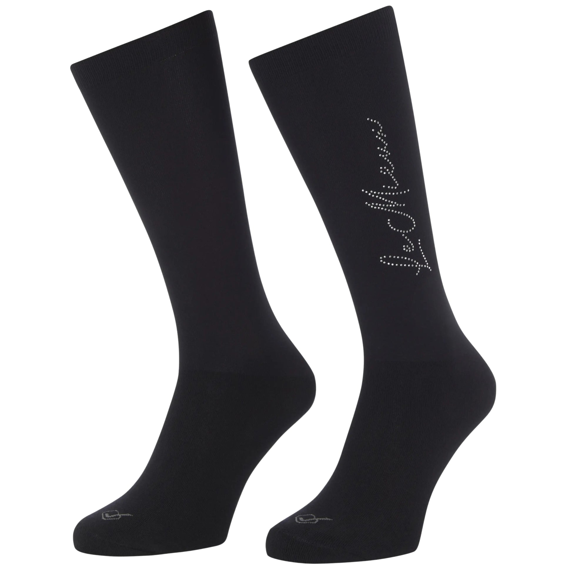 These competition socks offer a seamless, lightweight design for exceptional close contact. Crafted with a finely woven foot and a topside seam, they ensure toe comfort. The leg compression provides a snug fit while minimizing bulk beneath tall boots. Finished with a micro-stretch leg adorned with crystal LeMieux branding, they add a refined touch ideal for competition day.