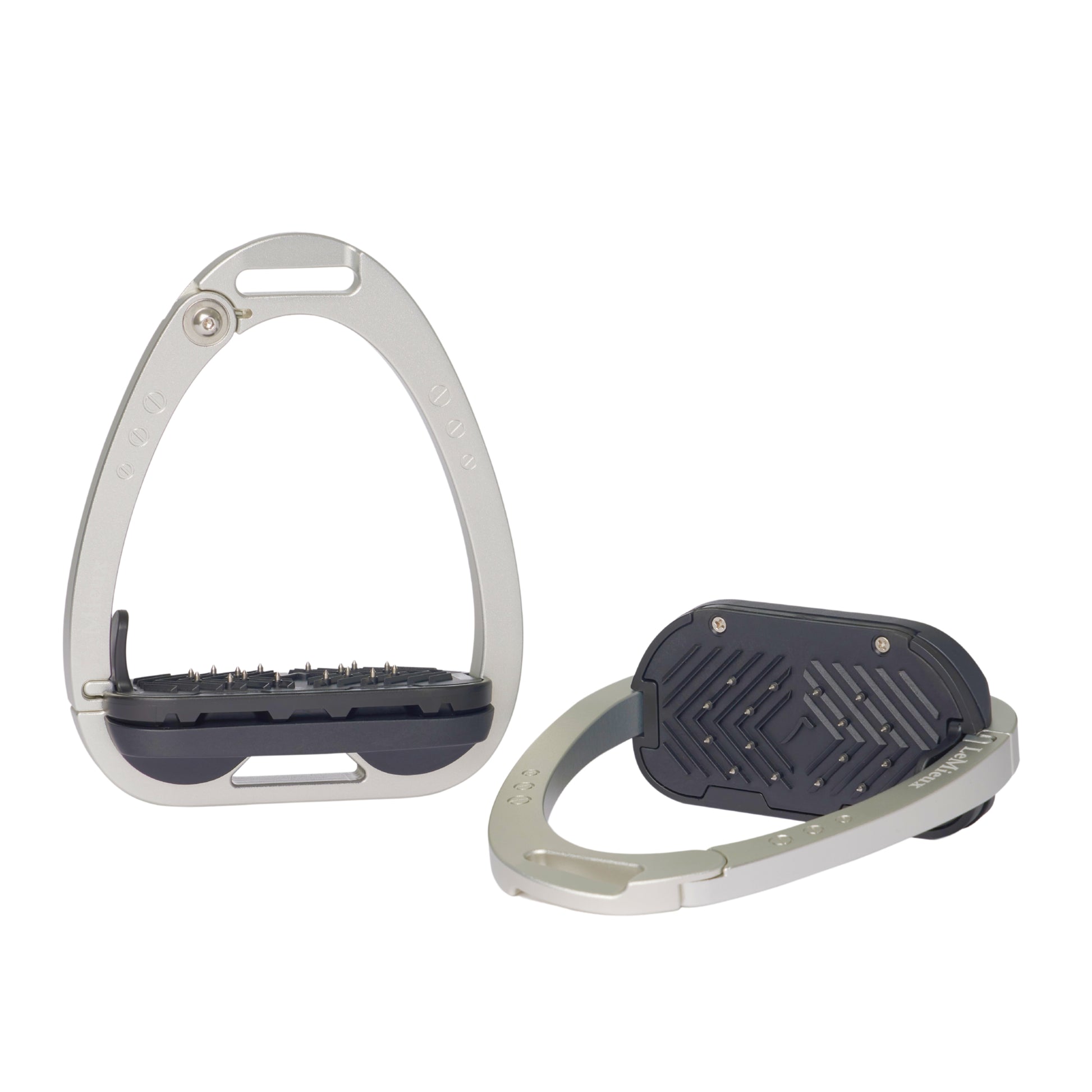 The footplate is supported by a twin-balance arch system that distributes the weight evenly across the base of the stirrup frame. The apex of the frame is recessed and off-set, encouraging a 45° outward orientation which makes it easier for the rider to locate the optimum angle for the foot and regain a lost stirrup.