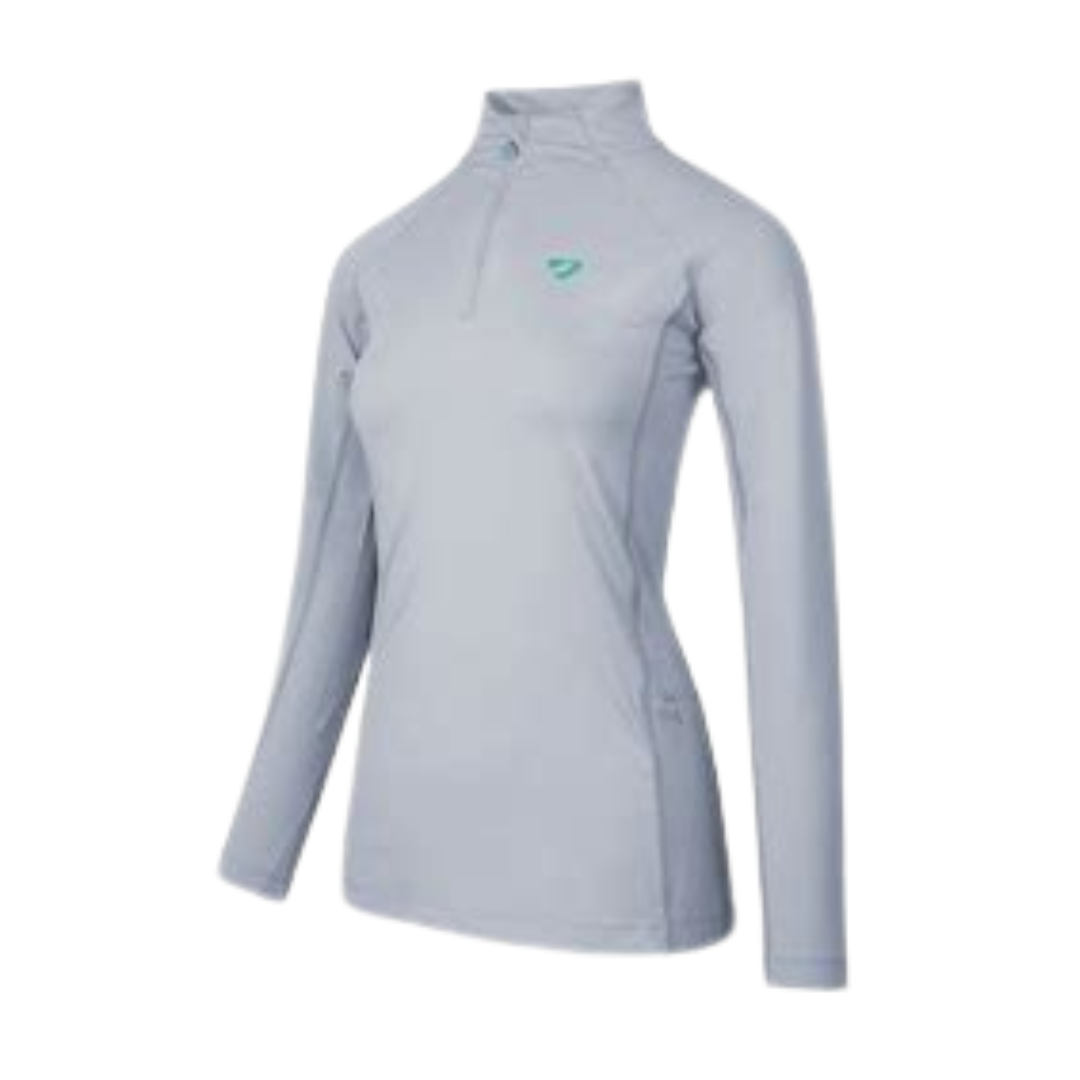 Shires Aubrion Newbury Maids Long Sleeve Base Layer - Grey. Designed to move with you, this quick drying ladies long sleeve base layer features soft mesh panels for maximum airflow. Other features include main stretch fabric UPF50+ for excellent sun protection, 1/4 zip, fitted shape, flatlock seams, concealed zip phone pocket, Aubrion emblem.