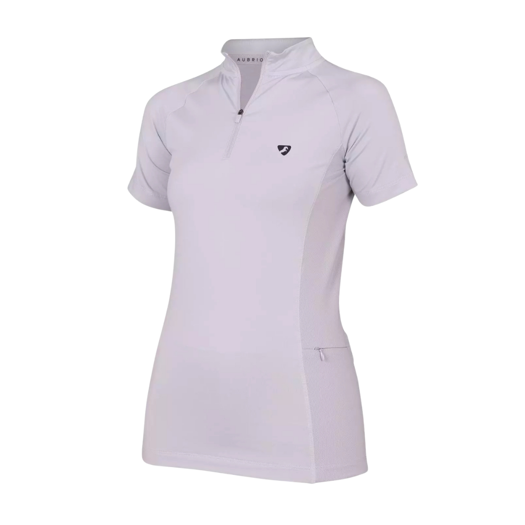 Shires Aubrion Newbury Maids Short Sleeve Base Layer - Grey. Designed to move with you, this quick drying ladies long sleeve base layer features soft mesh panels for maximum airflow. Other features include main stretch fabric UPF50+ for excellent sun protection, 1/4 zip, fitted shape, flatlock seams, concealed zip phone pocket, Aubrion emblem.