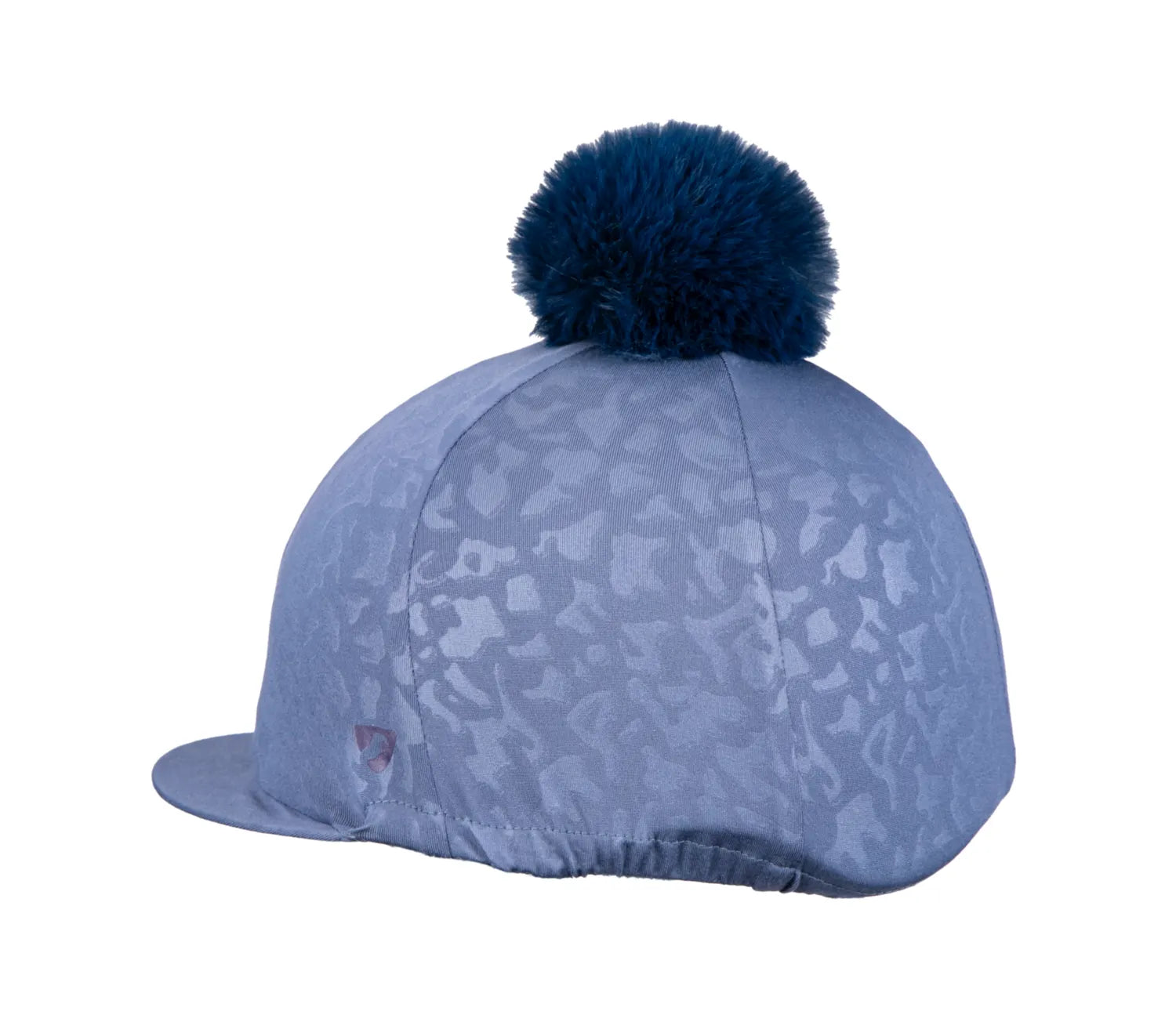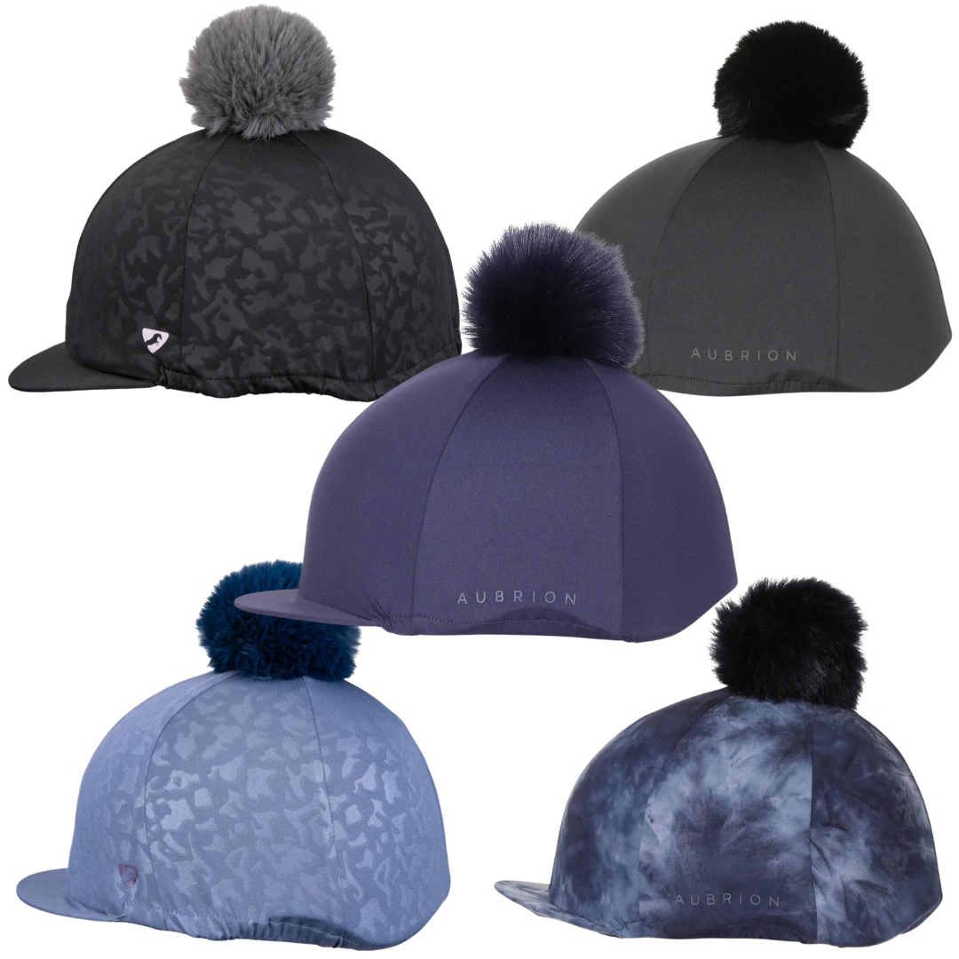 Top off your riding outfit with a matching Aubrion hat cover. Featuring a faux fur pom pom and a subtle embossed design. Fabric is stretchy and the hem is elasticated for a secure fit on any skull cap.