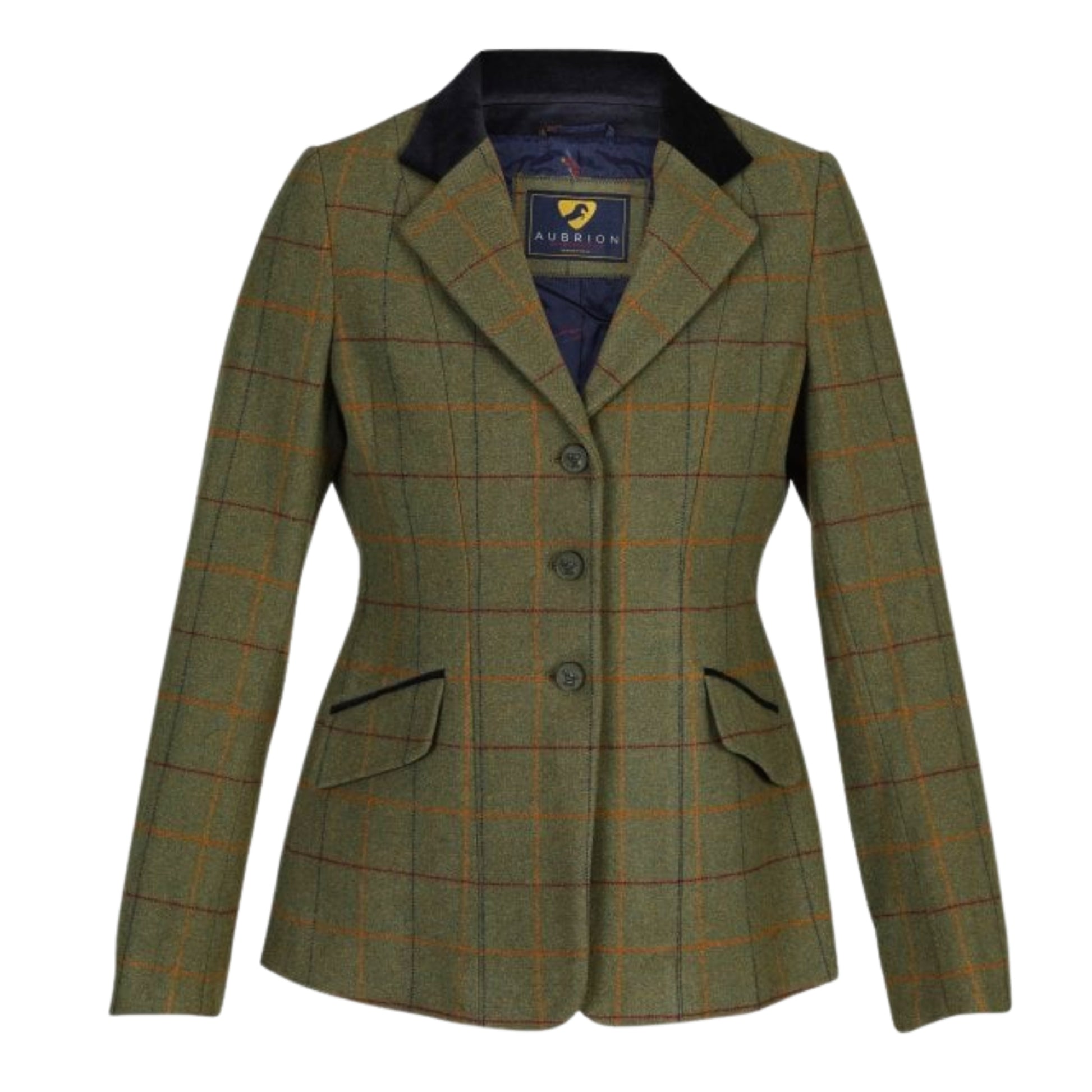 The Aubrion Saratoga jacket is a timeless piece designed with a modern, flattering contour fit that allows unrestricted movement in the saddle. Crafted from attractive wool-rich tweed, it features velvet trims on the revere notch collar and pocket flaps, complemented by a full satin lining for a refined finish. Ideal for showing, competition, and countryside activities, this jacket includes classic details such as a three-button front, buttoned cuffs, back vents, and two flap pockets, combining style with functionality.