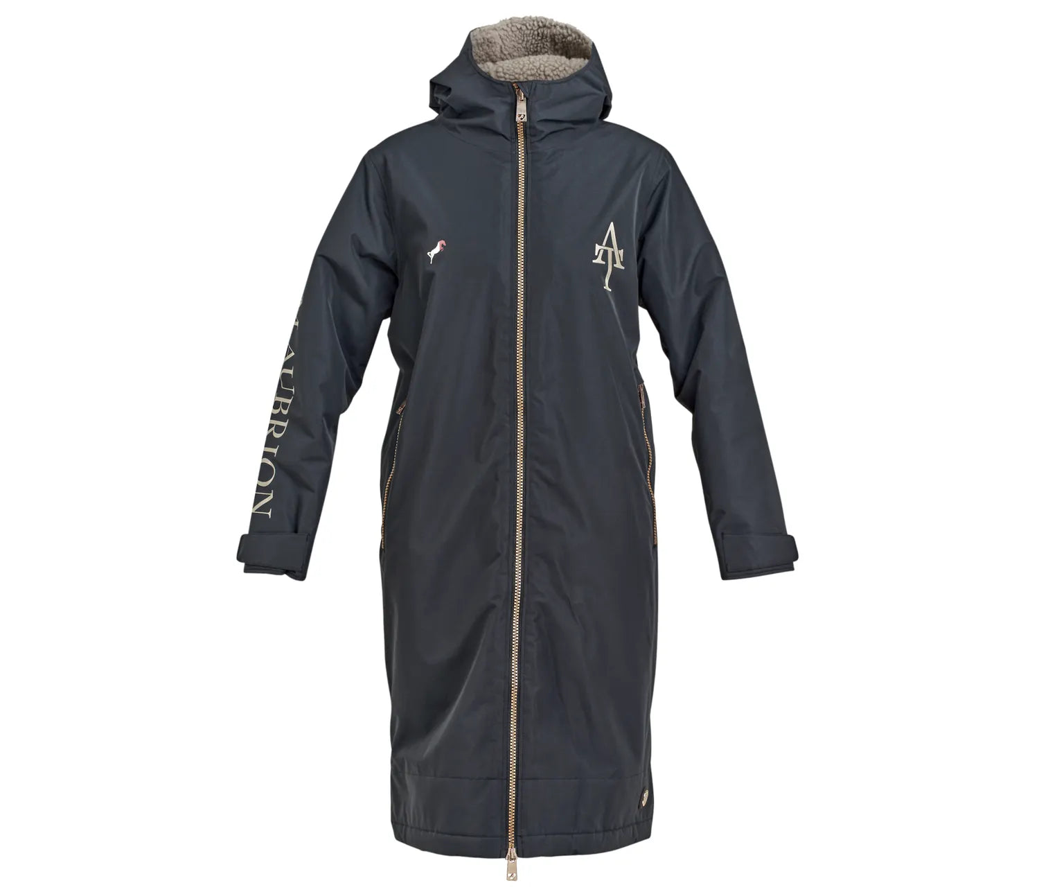 The ultimate winter layer gets the Aubrion Team treatment, bringing a luxe feel to the all weather robe. Waterproof, breathable and lined with borg fleece to ensure the weather is kept out. A two way front zip and rear riding vent offers flexible wear in or out of the saddle. The detail: roomy fit, calf length, grown on hood, two way front zip, hidden rear vent, two outer zip pockets, one inner zip pocket, cuff adjusters, lower hem emblem badge, Aubrion Team prints. Outer fabric waterproof rating: 5000mm with breathability rating 5000g/m2/24h. DWR (durable water repellent) finish causes moisture to shed, bead up and roll off the outer surface of the garment to help maintain breathability.