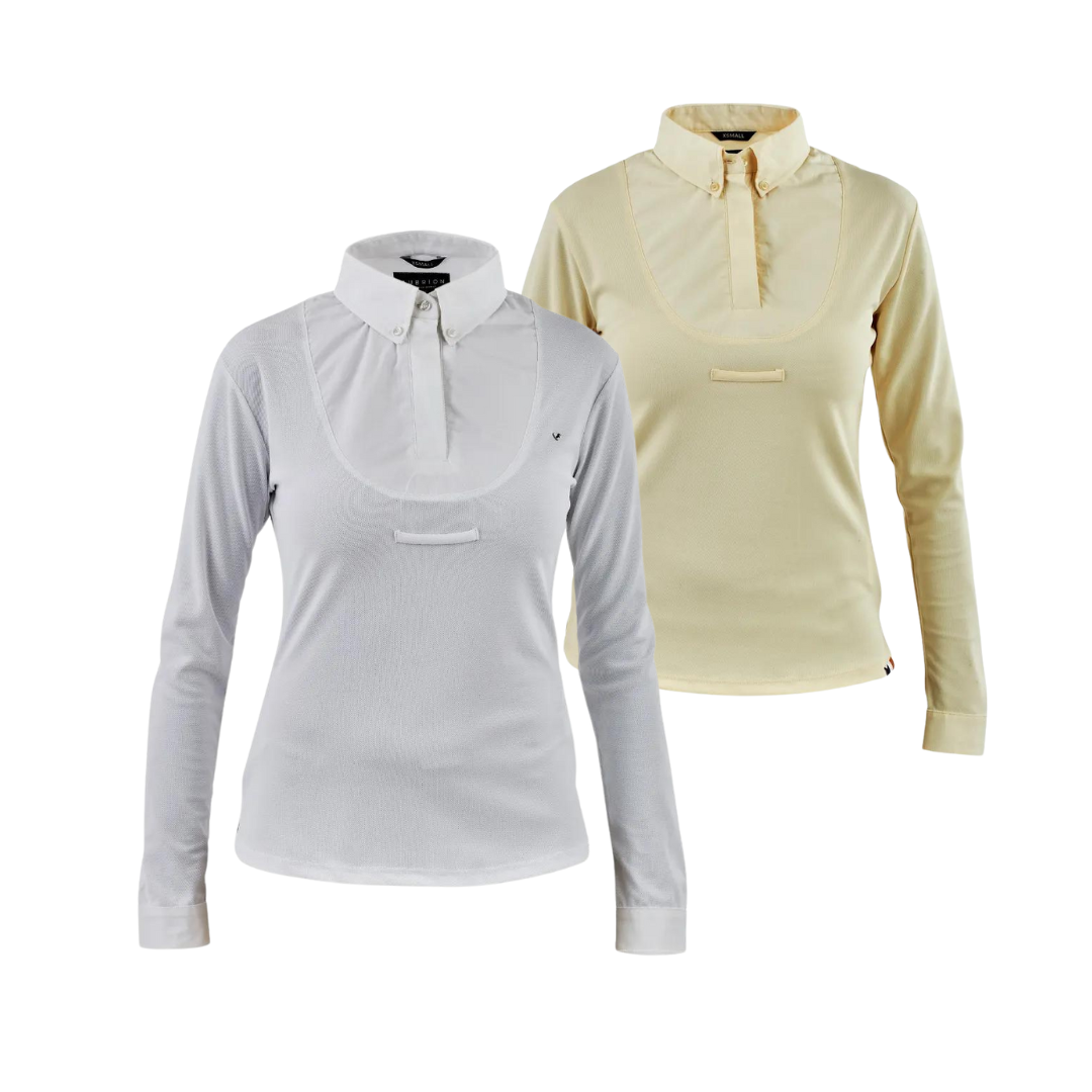 A classic look with sportactive technology, the Aubrion long sleeve tie shirt keeps the competitive rider cool and comfortable. Designed in AIR DRI fabric, the shirt feels soft and fluid, active air circulation technology helps the shirt to breathe, wicking moisture away to keep skin dry and comfortable. The cotton tie collar, bib and cuffs look smart, the hidden quick zip closure is finished with a top collar button. Further detail: tie keeper loop, moisture wicking, quick drying, signature embroidery, Aubrion badge and prints.