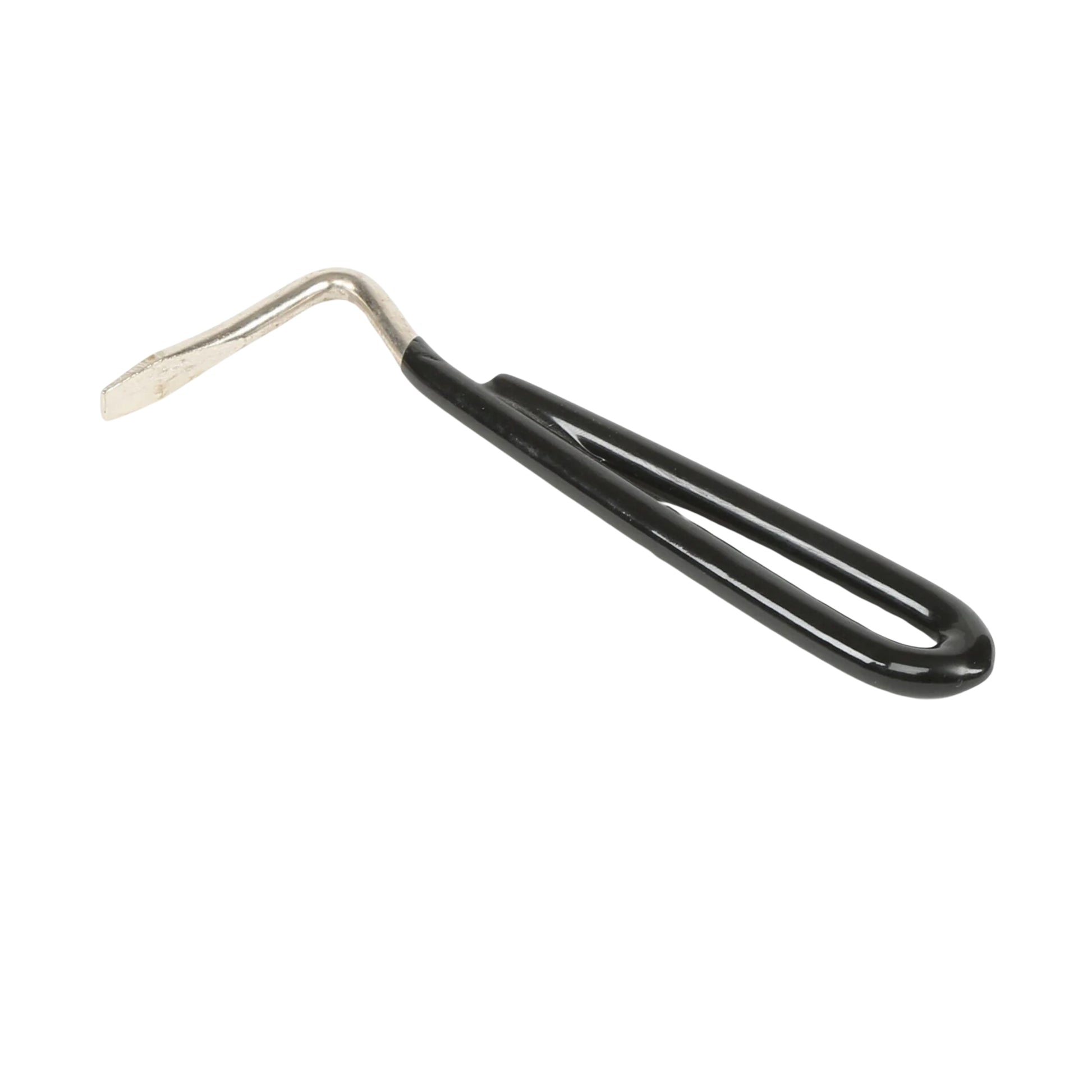 The Shires EZI-GROOM Pear Shaped Hoof Pick is a durable metal tool featuring a vinyl-coated handle for added comfort and grip.
