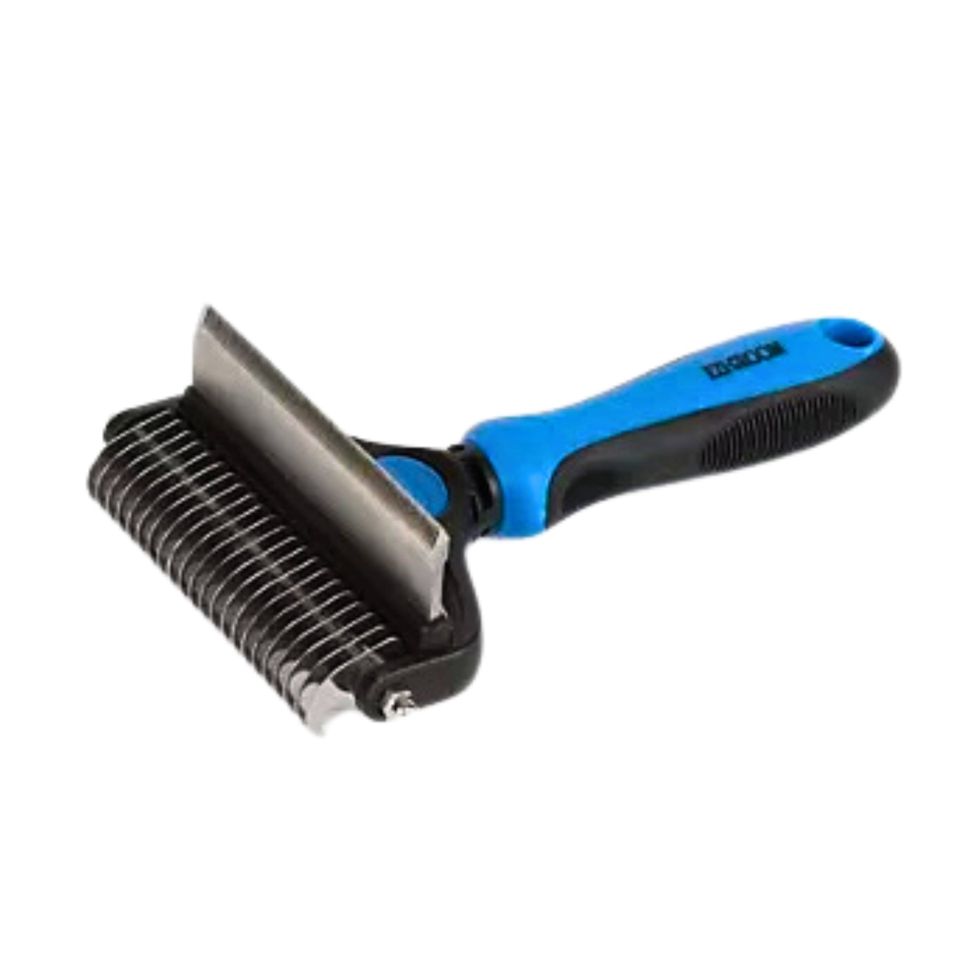 This multi-purpose Shires Ezi-Groom tidy up comb features both a de-shedding and rake comb, making grooming an effortless task. Crafted from stainless steel, this comb not only promotes healthy skin and a shiny coat, but also gently removes matted hair from the mane and tail. With its soft-hold grip and contoured shape, it offers a comfortable and secure hold. Please refrain from using on facial or bony joint areas.