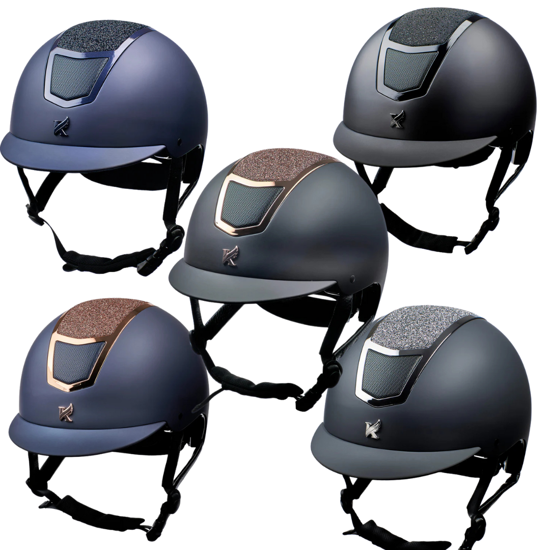 The most glamorous of them all, feel like a star in the Valentina riding hat. High shine accents frame a central panel which is crowned with eye catching crystals. The safety standards are BSI tested to PAS015:2011 for confidence whilst thermoregulating linings and air vents keep the head cooled. FINER DETAIL: Low profile form. Smooth, lightweight outer shell. Neat and flattering flexible peak. BESPOKE FIT micro-adjustable dial system. MAXIMUM COOLING EFFECT front and rear air vents. THERMOREGULATING 3D mesh liner. CoolDryTM headband. Expanded polystyrene inner shell with ventilation holes. Fully adjustable 4-point harness with leather look side panels. Quick release harness buckle. Removable anti-rub chin guard. Machine washable removable inner linings. PAS 015:2011 and BSI KITEMARK.
