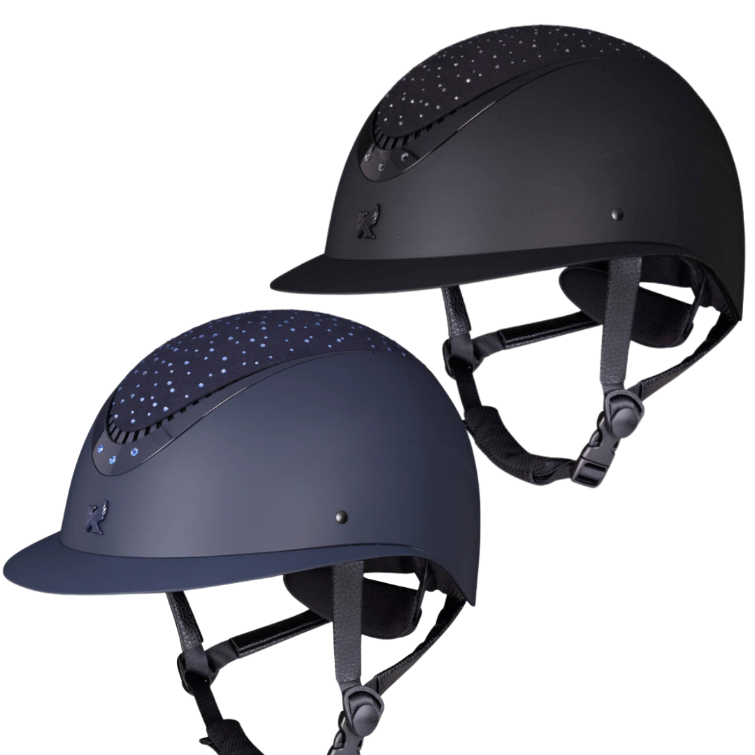 Fine tune your fit with dial adjusted Karben Ellipse riding hats. The Viola shows off your style from all angles. Self-colour rhinestones stud the crown, a rhinestone trio set into the ellipse frame, draw the eye. Designed with carefully balanced geometry, the wide peak frames the face, the low profile sits deep on the head. FINER DETAIL: Scratch resistant carbon wrapped rim. Velvet touch under peak lining. BESPOKE FIT Micro Adjustable Dial System. PASSIVE VENTILATION SYSTEM air channels vent towards the head. SHOCK ABSORBING expanded polystyrene inner shell engineered with targeted ventilation shafts. Flexible fixed peak for impact energy absorption. Deeply padded COMFORT LUXE LINER with CoolDryTM headband and THERMOREGULATING 3D mesh crown. Fully adjustable 4-point harness with soft faux leather wrapped sides. Quick release buckle. Removable anti-rub chin guard. Machine washable linings. Reusable drawstring storage bag. CE & UKCA BSI Kitemark PAS 015:2011 and VG1.