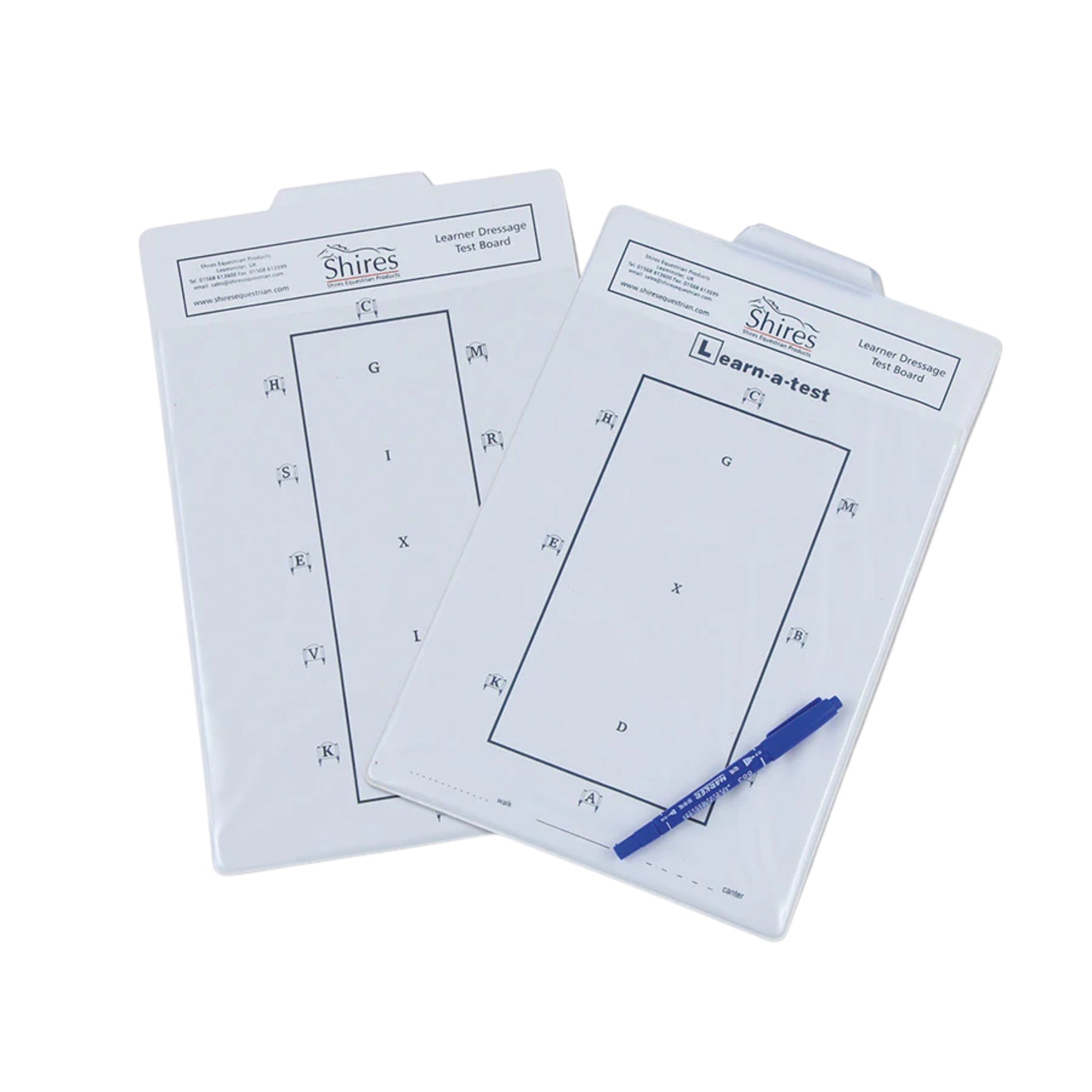 Enhance your dressage practice with this practical double-sided board, featuring the long arena layout on one side and the short arena on the other. Designed for off-horse use, it includes a wipe-clean surface and comes with a wipe-off pen for easy note-taking. Measuring 35cm (14") by 23cm (9"), this learner dressage test board is an essential tool for focused training.